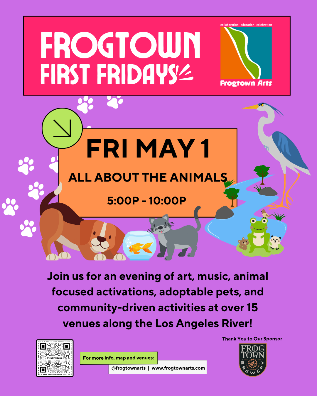 Back to All Events Frogtown First Fridays — All About the Animals Friday, May 1, 2026 5:00 PM 10:00 PM Google Calendar ICS Come out for an evening of art, music, animal focused activations, adoptable pets, and community-driven activities at over 15 venues along the Los Angeles River!Learn more
